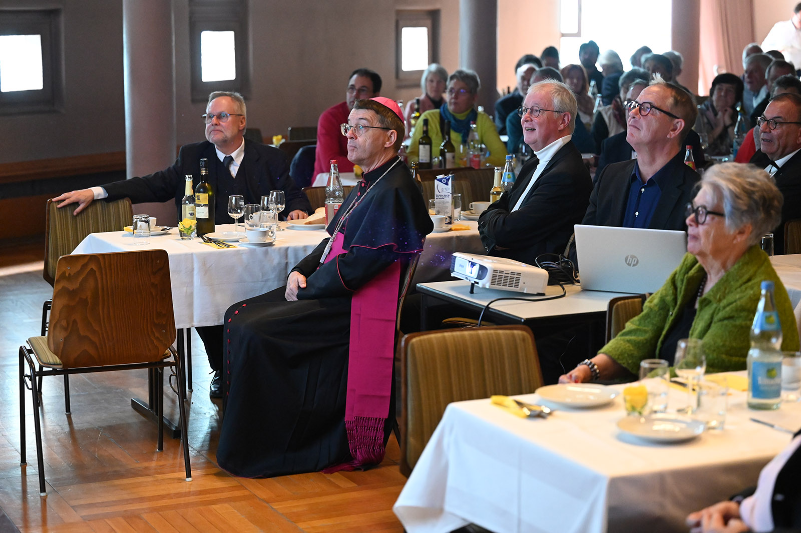 Nach dem Pontifikalamt im Deutschordensmünster – dem einzigen, das ihm bekannt sei, so Hochmeister und Generalabt Frank Bayard – gab es im Gemeindehaus die Speisung der hungrigen Gemeinde. Nach Böckinger „Feldgschrei“, was eine habhafte Brühe mit Bohnen, Karotten und Spätzle ist, wurde noch der Geist im Gespräch gestärkt. Pfarrer Roland Rossnagel hatte den früheren Leiter des Stadtarchivs Christhard Schrenk für die humorvolle wie kenntnisreiche Moderation gewinnen können.