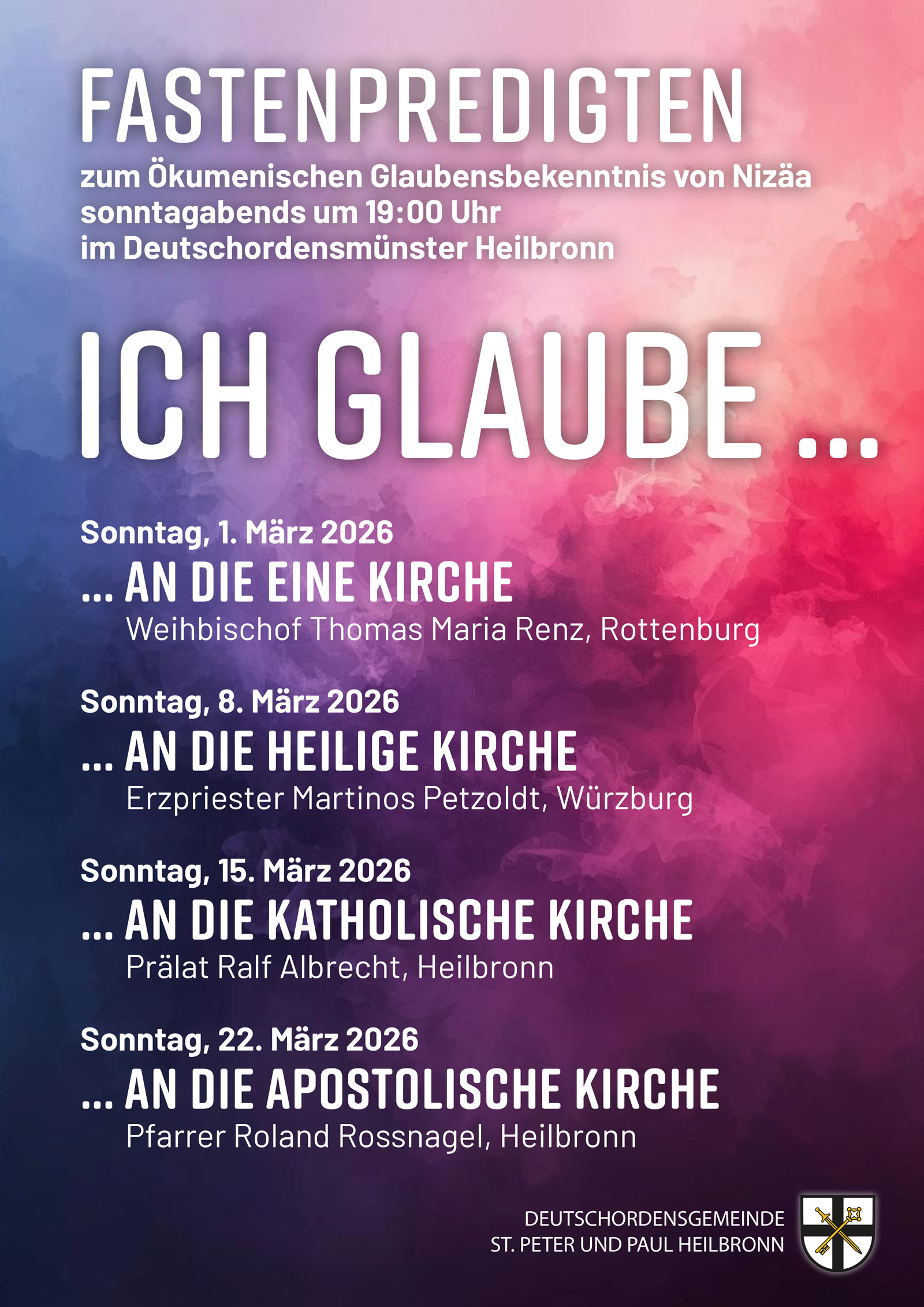 Am 1.3.2026 kommt Weihbischof Thomas Maria Renz aus Rottenburg ins Deutschordensmünster mit dem Thema „Ich glaube an die eine Kirche“.